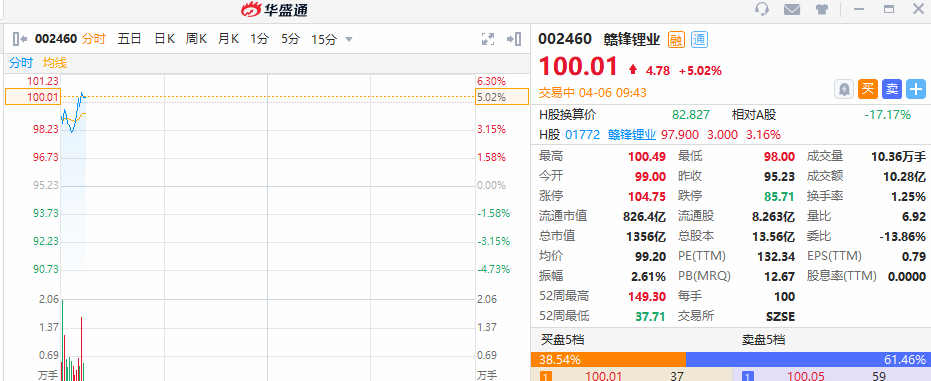 华盛资讯4月6日消息,赣锋锂业A股早盘强势走高。截至发稿,涨5.02%,现报每股100.01元,总市值1356亿元。
