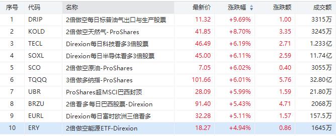从ETF涨幅榜来看,涨幅居前的主要与做空能源和看多半导体的ETF相关,其中DRIP、KOLD、TECL和SOXL涨幅居前,具体如下: