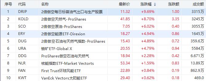 2倍做空每日标普油气出口与生产股票的DRIP涨近10%,成交额3315万美元;2倍做空原油的SCO涨超6%,成交额3055万美元;