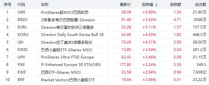2倍看多每日巴西股票的BRZU涨5.43%,成交额20687万美元;拉丁美洲3倍看多股票的LBJ涨超4%。