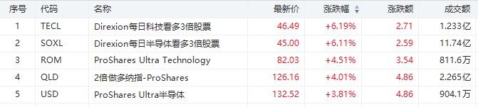 每日科技看多3倍股票的TECL、每日半导体看多3倍股票的SOXL均涨超6%,成交额分别为1.23亿美元、11.74亿美元。