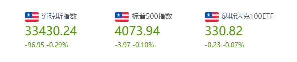 道指跌96.95点,或0.29%,报33430.24点;纳指跌7.21点,或0.05%,报13698.38点;标普500指数跌3.97点,或0.10%,报4073.94点。