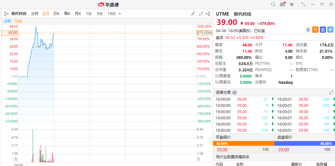 截至收盘,联代科技股价报39美元,涨幅875%,市值3.2亿美元。