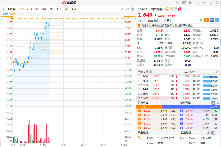 国美零售(00493)早盘逆市拉升,截至发稿,涨8.61%,报1.64港元,成交额2.66亿港元。