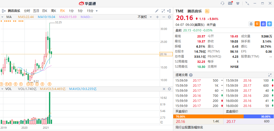 从过往股价上看,腾讯音乐从2020年4月至2021年3月累计最大涨幅超过249%。