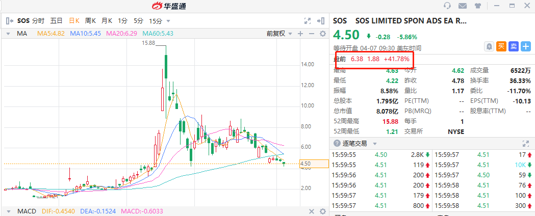 华盛资讯4月7日讯,今日美股盘前,部分区块链概念股走高,SOS(SOS)涨超40%,嘉楠科技(CAN)涨超2%。