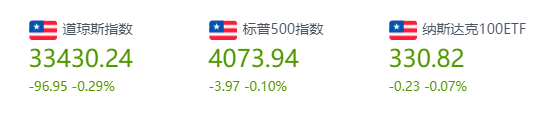 周二美股收盘,道琼斯指数跌0.29%,报33430.24点;标普500指数跌0.10%,报4073.94点;纳斯达克综合指数跌0.05%,报13698.38点。