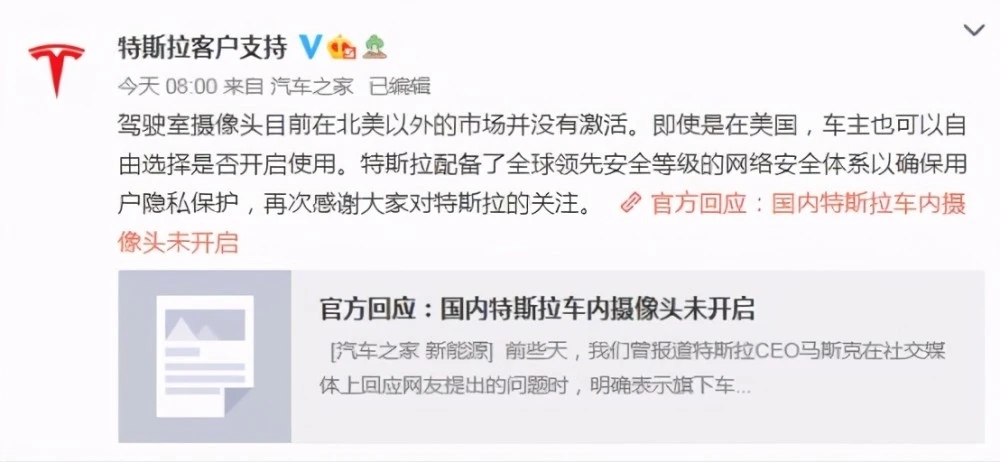 4月7日,特斯拉官方对于车内摄像头引发网络热议一事作出回应称,驾驶室摄像头目前在北美以外的市场并没有激活。即使是在美国,车主也可以自由选择是否开启使用。