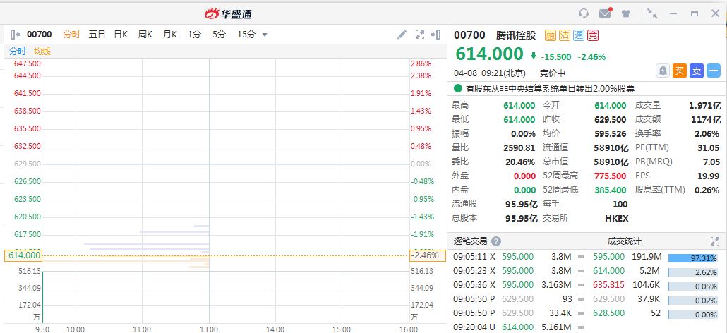 腾讯控股开盘跌2.46%,目前股价报614港元,成交1174亿港元。