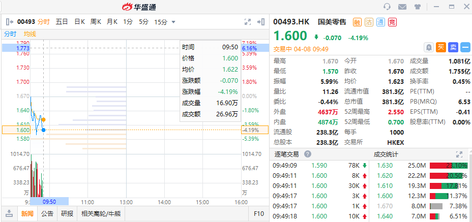 华盛资讯4月8日消息,昨日晚间国美零售创始人黄光裕举行了全球投资人电话会议,也是他在获释后正式回归国美的首次面对全球投资人发声。今日国美零售低开,截至发稿,国美跌4.19%,现报每股1.6港元,总市值381.3亿港元,成交量1.081港元。