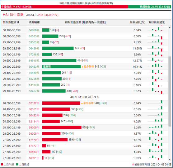街货分布方面,至周三,恒指牛证街货在收回价28100点至28600点之间,过夜街货相当约2024张期指合约;恒指熊证街货在收回价29100点至29600点之间,累计相当约1665张期指合约。