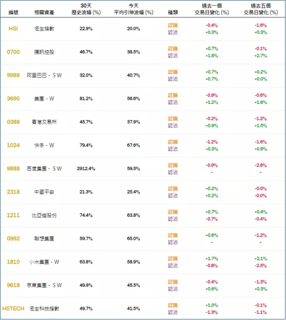 周三恒指相关权证的平均引伸波幅报约20%,继续按日小幅下降。个股方面,小米相关认购证的引申波幅小幅上升,腾讯、美团相关认沽证的引伸波幅按日小幅上升。