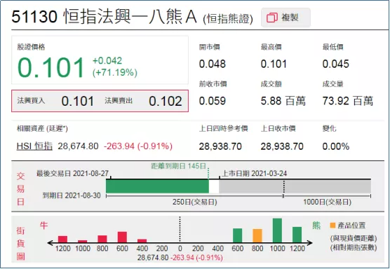 1、强势轮证:恒指法兴一八熊(51130.HK),周三大涨71.19%;