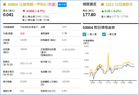 2、看错方向:比迪瑞通一甲熊(53954.HK),周三下跌4.7%。