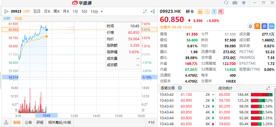 华盛资讯4月8日消息,今日移卡低开后拉升走高。截至发稿,移卡上涨5.83%,现报每股60.85港元,总市值272亿港元。