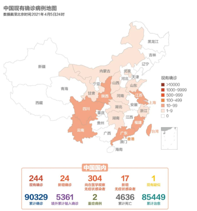 同时,中国国内正全民普及新冠疫苗,截止4月5日,全国累计报告接种新冠病毒疫苗1.4亿剂,接种的7日均值维持在454万剂以上。目前中国接种疫苗总剂数仅次于美国,位列全球第二位。