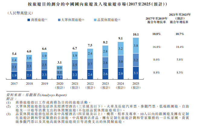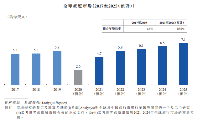 据易观报告,中国已成为全球最大的旅游市场,2019年国内旅游和入境旅游总人次达62亿,并预计2025年将达到75亿。2019年中国国内旅游和入境旅游市场规模为6.6万亿人民币,占全球旅游市场的18%。在强劲的经济增长和持续消费升级的推动下,加上疫苗的全面普及,中国在可预见的未来将继续保持全球旅游行业重要的市场地位。