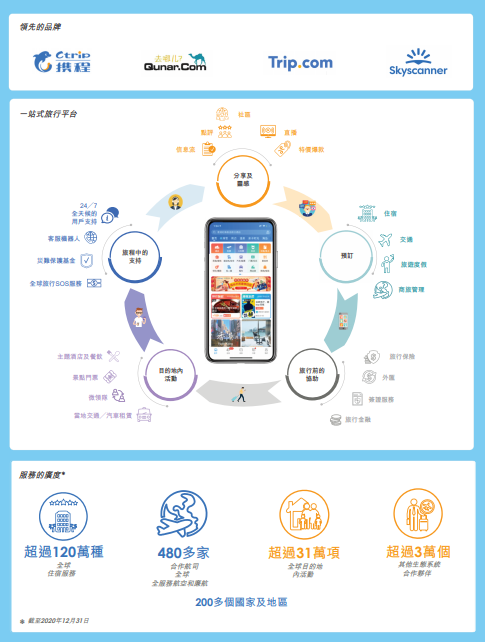 据易观报告,以商品交易总额(GMV)为口径统计,携程在过去十年一直都是中国最大的在线旅游平台,并在2018年开始连续三年成为全球最大在线旅游平台,拥有携程、去哪儿网、Trip.com等全球知名品牌。截止2020年12月31日,携程在全球拥有超过120万种住宿服务,和480多家航空公司合作,在全球200多个国家和地区展开服务。