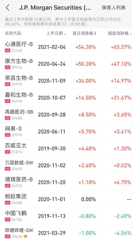 另外,此次携程回港上市的保荐人为摩根大通,其保荐记录良好。近两年共保荐13家公司,上市首日收益率为正的公司占比69.2%,排名中上。其中保荐过的如心通医疗-B、康方生物-B、荣昌生物-B等牛股,投资者可以作为参考。