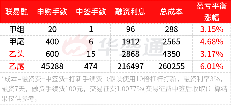 乙头融资打新600手,利息2868港元,中签15手为例,盈亏平衡点3.17%;顶头槌打新45288手,利息21.6万港元,盈亏平衡点6.01%。