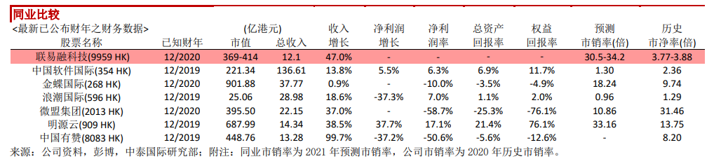 安信国际证券发表观点,公司招股市值对应 2021E P/S 大约为 22-24x。目前港股 SaaS 板块2021E P/S 平均为 18x,美股 SaaS 板块 2021E P/S 平均为 15x。尽管公司整体估值偏高,但公司基本面优秀,是港股所缺少的纯正 SaaS 标的,且公司处于一个拥有广阔市场空间同时快速增长的赛道,长期增长潜力大,可以享受一定估值溢价。