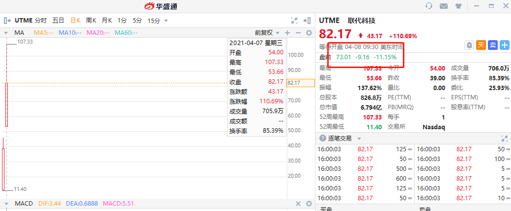 华盛资讯4月8日讯,今日美股盘前,次新股联代科技(UTME)下挫,截至发稿,跌超11%,报73.01美元。联代科技周二登陆纳斯达克,是中国手机和配件制造商,首日挂牌交易一度较其IPO发行价飙升1050%,次日收涨超110%。