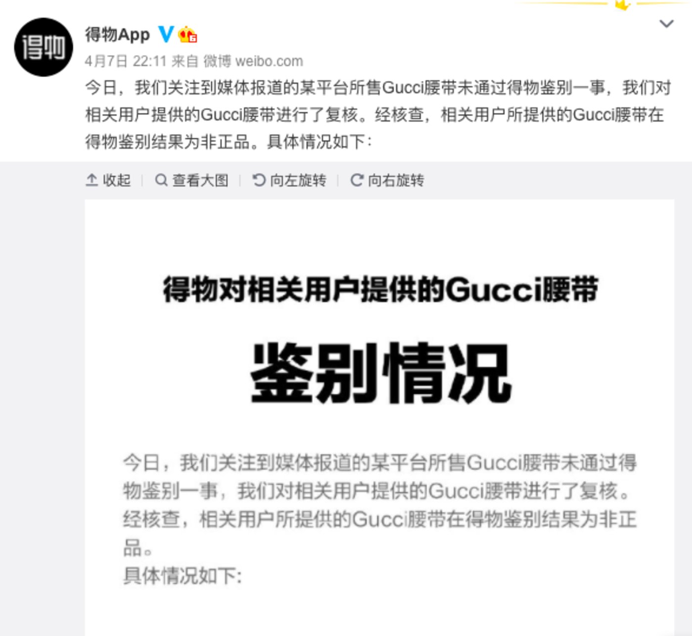 稍晚一点,得物App也做出回应,表示“今日,我们关注到媒体报道的某平台所售Gucci腰带未通过得物鉴别一事,我们对相关用户提供的Gucci腰带进行了复核。经核查,相关用户所提供的Gucci腰带在得物鉴别结果为非正品。”