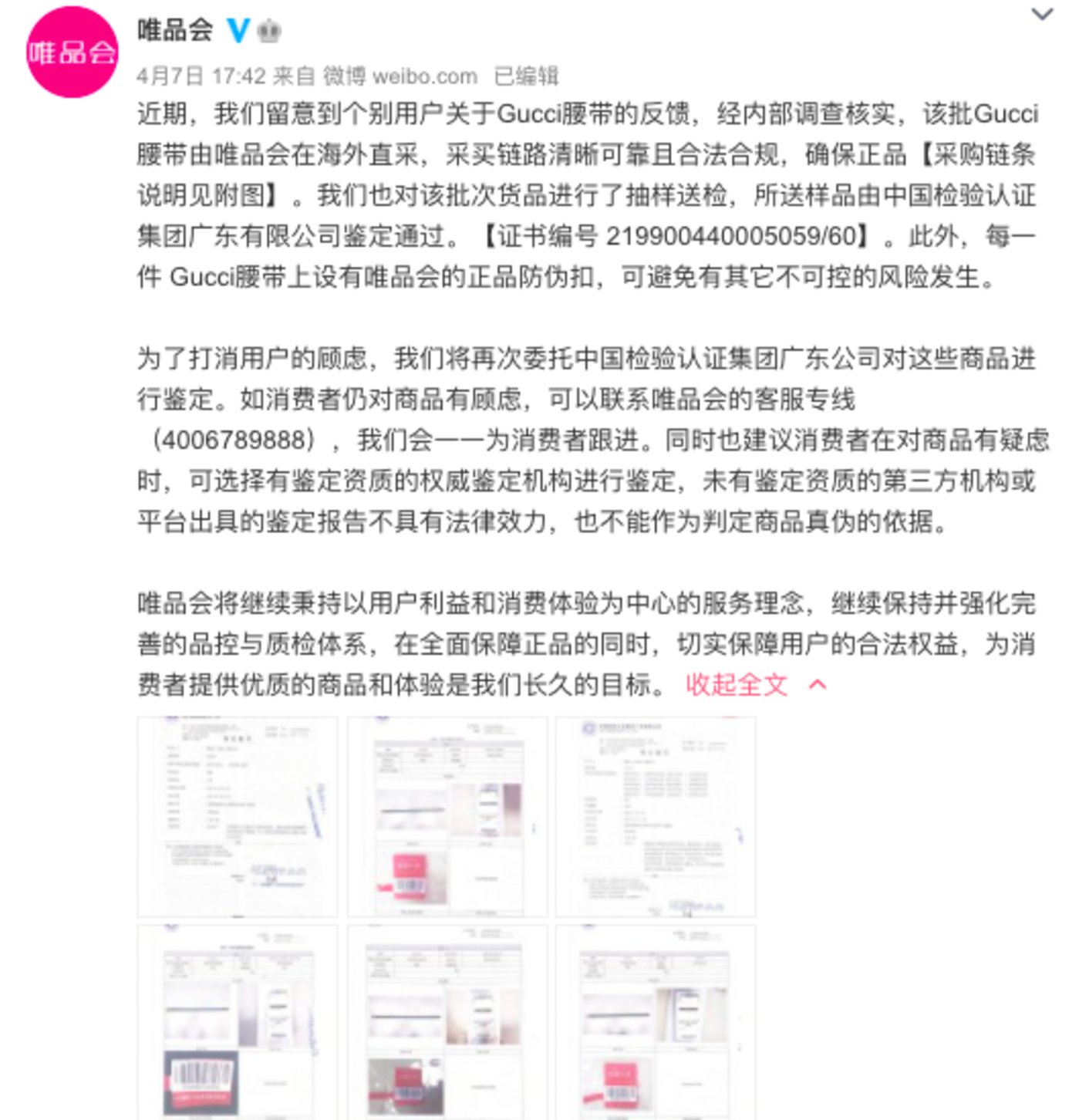 4月7日下午,唯品会官方微博发布博文再次回应称,经内部调查核实,该批Gucci腰带由唯品会在海外直采,采买链路清晰可靠且合法合规,确保正品。