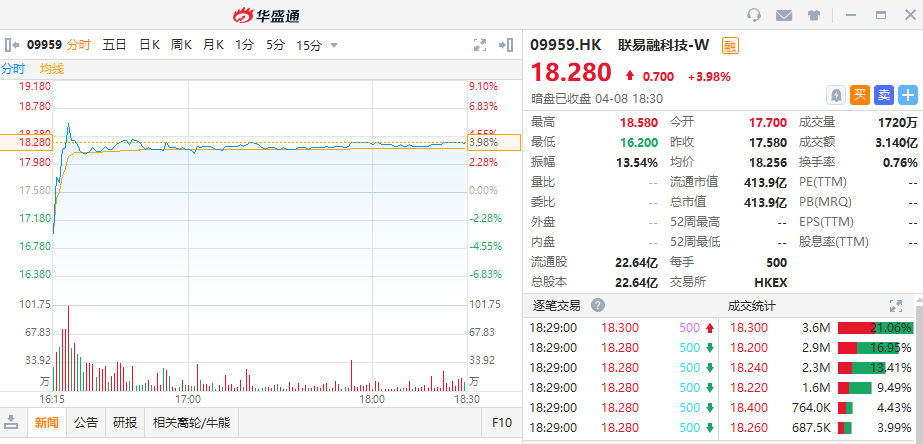华盛资讯4月8日讯,金融科技公司联易融科技-W(09959.HK)暗盘收报18.280港元,较发行价17.580港元上涨3.98%,一手账面盈利350港元。该股开盘一度破发,全日振幅超13%,成交额为3.140亿港元,最新总市值超413亿港元。该股将于明日正式上市。
