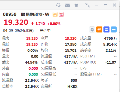 华盛资讯4月9日讯,联易融科技-W(09959.HK)今日首挂高开9.9%,报价19.32港元,一手账面赚870港币,成交量4766万,成交额达8.914亿港元,总市值437亿港元。