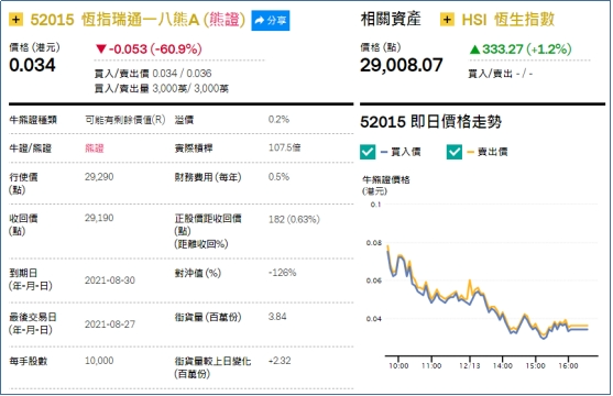 2、看错方向:恒指瑞通一八熊(52015.HK),周四大跌60.9%。