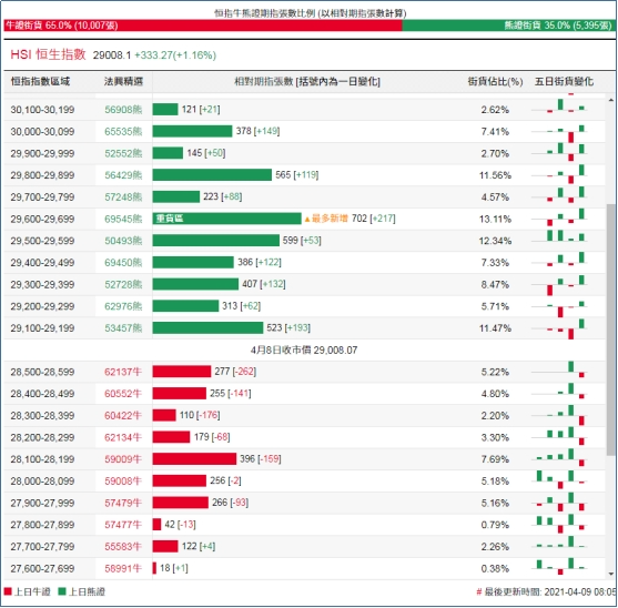 街货分布方面,至周四,恒指牛证街货在收回价28100点至28600点之间,过夜街货相当约1217张期指合约;恒指熊证街货在收回价依旧在29100点至29600点之间,累计相当约2228张期指合约。