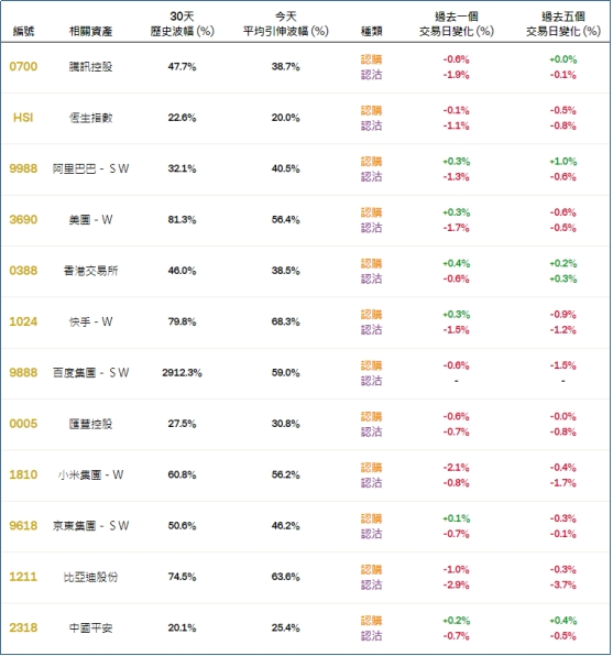 周四恒指相关权证的平均引伸波幅报约20%,维持不变。个股方面,阿里、腾讯、美团、快手等相关认沽证的引申波幅小幅下降,小米、比迪相关认购证的引伸波幅按日小幅下降。