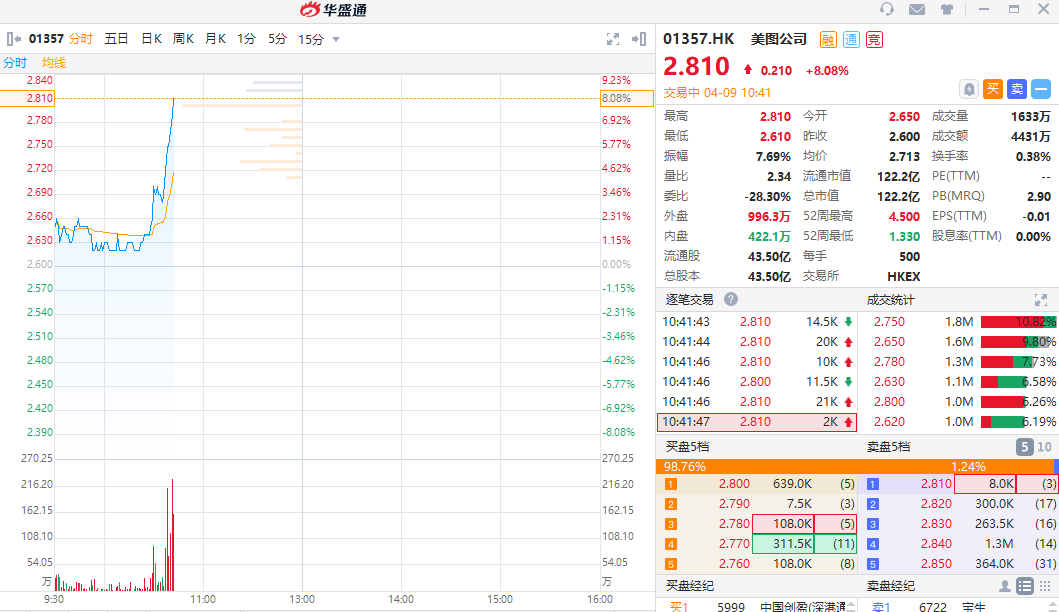 华盛资讯4月9日消息,美图公司盘中异动,直线拉升超8%,现报2.81港元每股,最新总市值122.2亿港元。