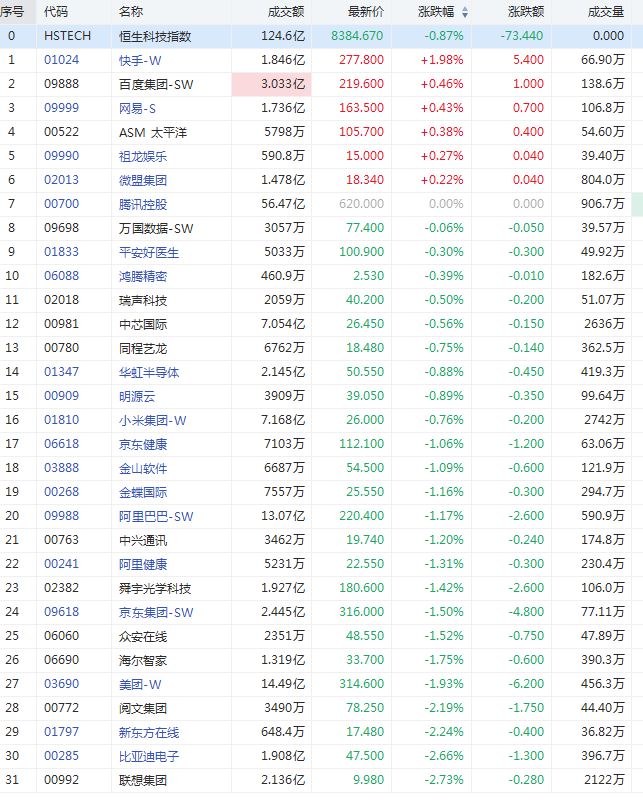 华盛资讯4月9日消息,恒生科技指数早盘由涨转跌。截至发稿,恒生科技指数跌0.87%。报8384点,快手-W涨1.98%领涨;微盟集团涨0.22%;百度集团-SW涨0.46%;网易-S涨0.43%。