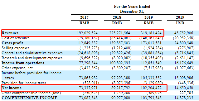 招股书中披露的财务数字表现十分亮眼,公司自2017-2019年的营收分别为1.92亿元人民币(单位下同)、2.25亿元和3.19亿元,同比增长17%、41.1%,呈明显的增长态势。不仅如此,公司已经实现了盈利,2017-2019年的净利润分别达到了0.73亿元、0.89亿元和1.1亿元,增幅也同样高达22%和24%。