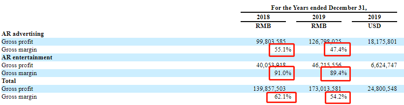 尽管收益较为亮眼,但具体来看的话,公司的收入大部分还是来自于AR广告服务,占比高达82.7%,而AR娱乐服务则占17.3%。值得注意的是,公司的毛利率非常高:AR娱乐项目甚至高达90%,AR广告业务毛利率也高达50%,综合毛利率在60%左右。可以看出,微美全息十分依赖收入占比极大的广告业务,因此一度被人调侃为“广告公司”。