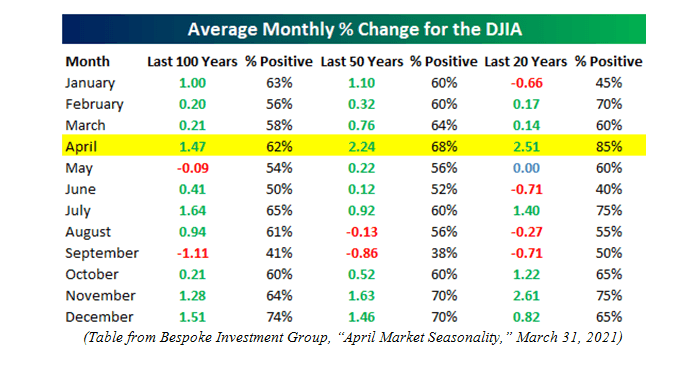 Bespoke Investment(BIG)研究人员指出,对于道指而言,4月是过去50年来最好的市场月份。报告指出,过去50年来,道指4月平均上涨2.24%;过去10年期间,道指平均涨幅为2.34%。