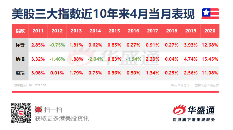 就各个指数的走势来看,近10年来,4月当月,标普500指数9涨1跌,纳指7涨3跌,道指10涨0跌。纳指表现稍弱之外,标普500指数和道指均表现良好。