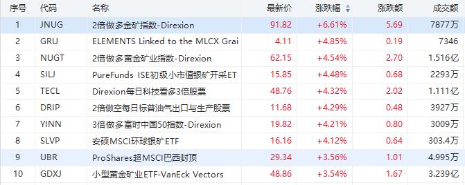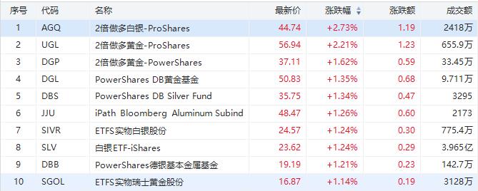 2倍黄金做多白银的AGQ涨2.73%,成交额2418万美元;2倍做多黄金的UGL涨2.21%,成交额655.9万美元。