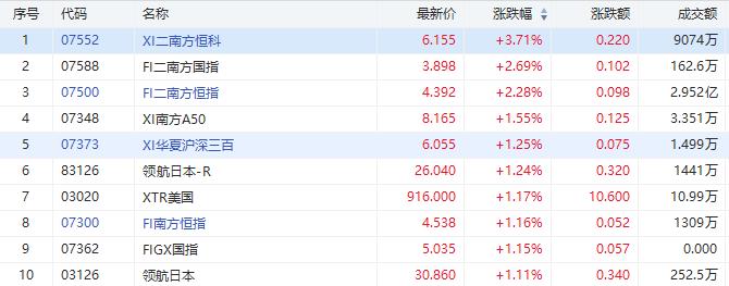 受消息影响,今日港股涨幅居前的ETF主要有南方两倍做空恒科涨近4%,成交额9074万港元;南方两倍看空恒指涨2.28%,成交额2.95亿港元。