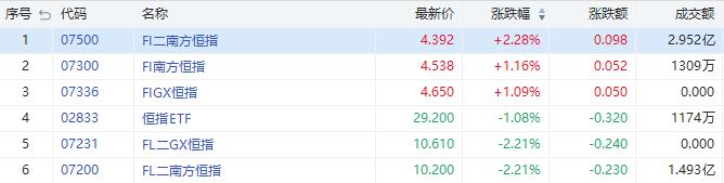 看空恒相关ETF走强,其中;南方两倍看空恒指(07500.HK)涨2.28%,成交额2.95亿港元。