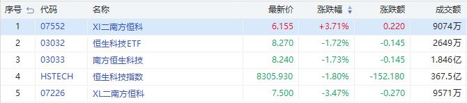 今日恒生科技指数跌1.8%。其中,南方两倍做多恒科(07226.HK)跌3.47%,成交额9571万港元;南方两倍做空恒科涨3.71%,成交额9074万港元。