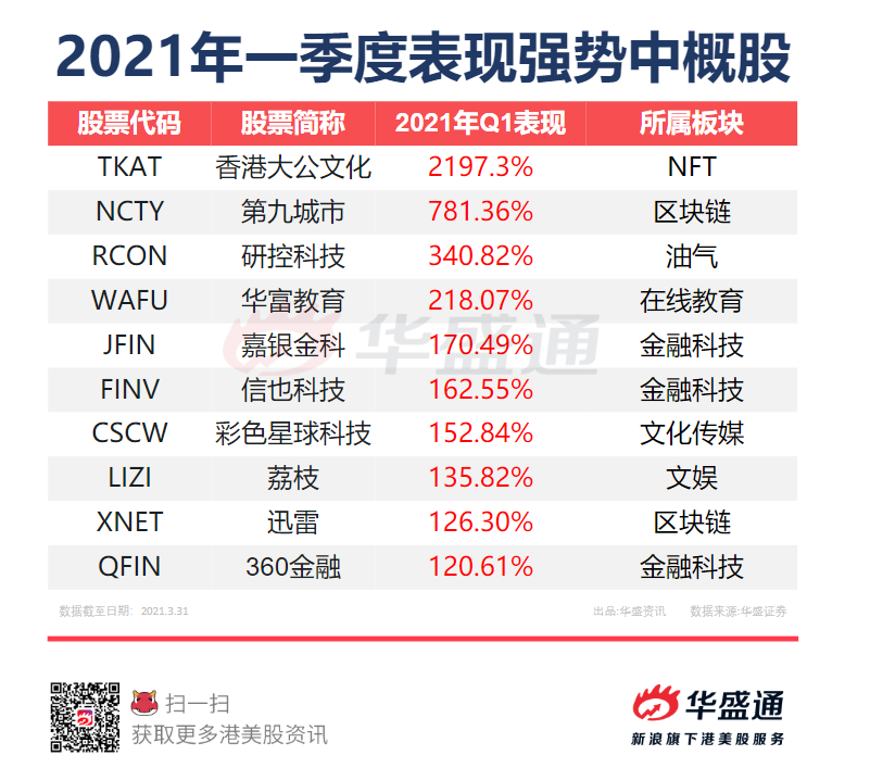 个股方面,美股有98只个股涨幅超过100%,61只中概股涨幅超过50%。根据华盛资讯统计,Q1涨幅前十的中概股包括香港大公文化、第九城市、荔枝、迅雷等,其中NFT概念股香港大公文化以2197.3%的涨幅遥遥领先,360金融以120.61%的涨幅排名第十。