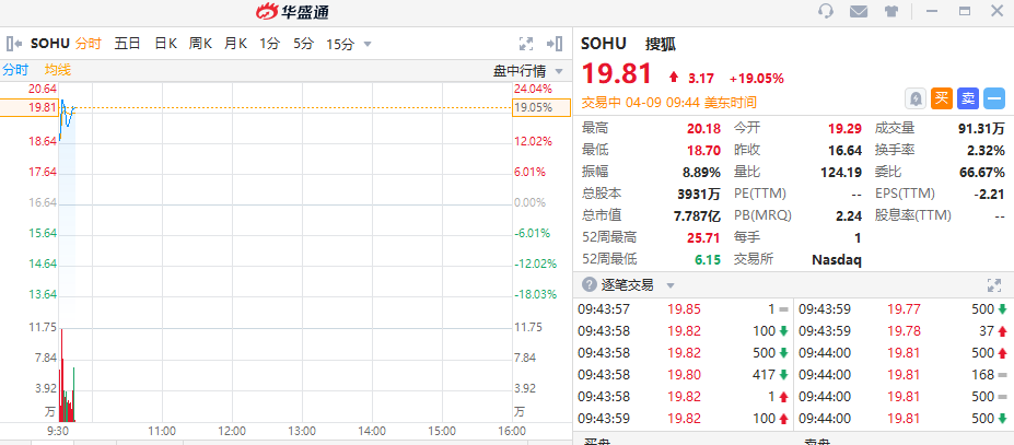 华盛资讯4月9日消息,搜狐(SOHU)高开高走,截至发稿,大涨超19%,搜狗(SOGO)涨超4%。