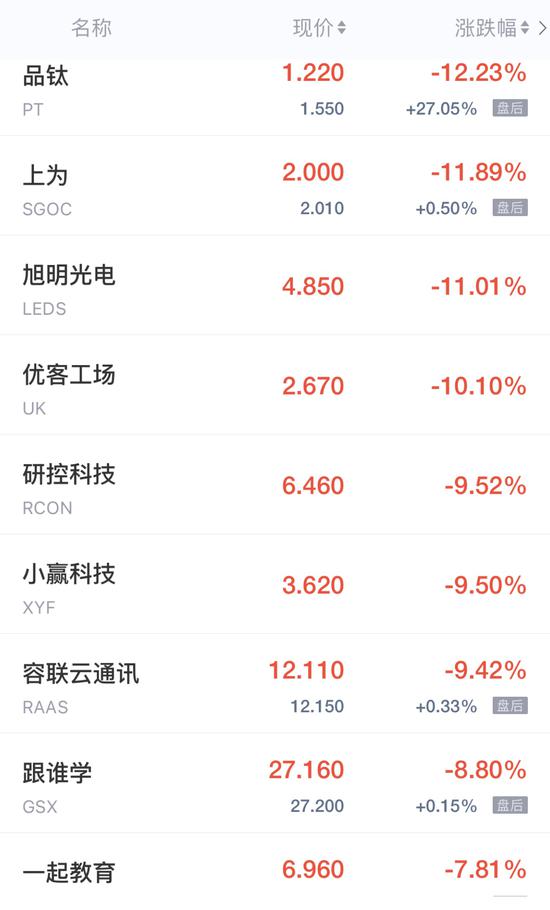 领跌中概股列表: