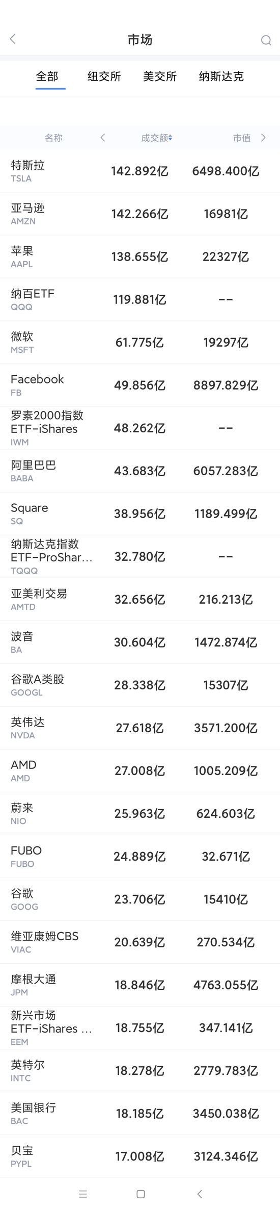 以下为美股当日交易最活跃的20只股票(按成交额):(截图来自新浪财经APP 行情-美股-市场板块 左滑更多数据)下载新浪财经APP