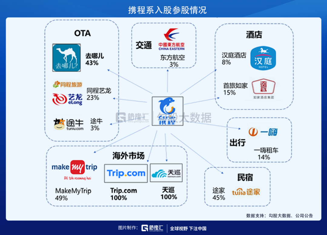 1999年,创始人梁建章当年从美国硅谷回国创业,组成了人称“携程四君子”的创业团队。经过互联网创业大潮的洗礼,公司 2003年于纳斯达克上市,如今携程是国内OTA行业的老大哥,经营的品牌包括携程、去哪儿网、Trip.com、Skyscanner(天巡)。主要业务包括酒店预订(占比38.94%)、交通票务(39.02%)、背包旅游(6.78%)、商旅旅行(4.79%)等。