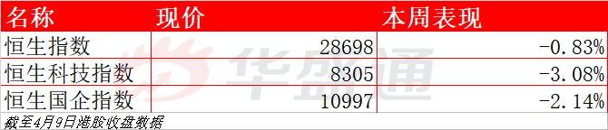 恒生指数本周跌0.83%,报28698;恒生科技指数本周跌3.08%,报8305;国企指数本周跌2.14%,报10977。