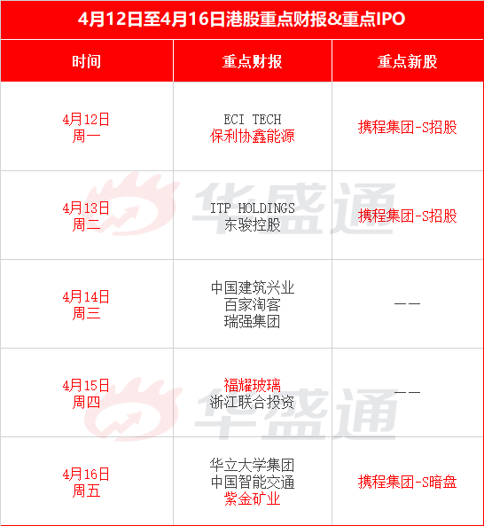 新股方面,全球旅游在线平台龙头携程集团(09961)招股期截至4月13日,并将于4月16日公布中签结果并进行暗盘交易,投资者可以重点关注。